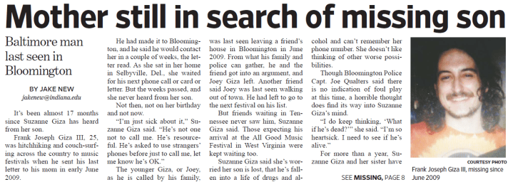 The younger Giza, or Joey, as he is called by his family, was last seen leaving a friend’s house in Bloomington in June 2009. From what his family and police can gather, he and the friend got into an argument, and Joey Giza left.