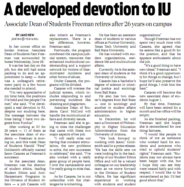 After working at IU for 26 years — 11 of them as the associate dean of students — Freeman is moving on, and, this week, Dean of Students Harold “Pete” Goldsmith officially named Jason Casares as Freeman’s successor.