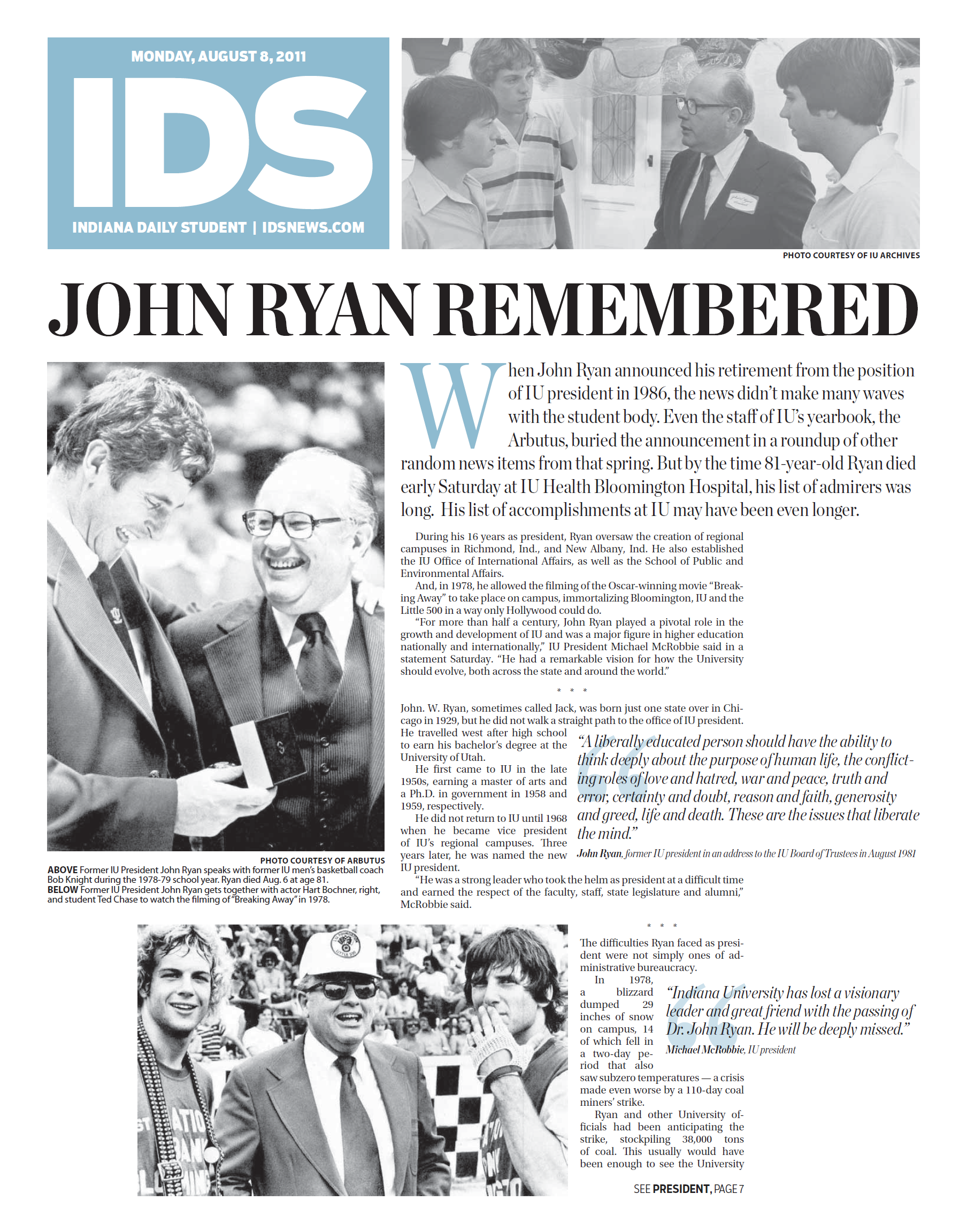 In-depth, NewspaperRemembering the legacy of former IU President John Ryan Continue reading “Remembering the legacy of former IU President John Ryan” Jake NewAugust 9, 2011August 9, 2011